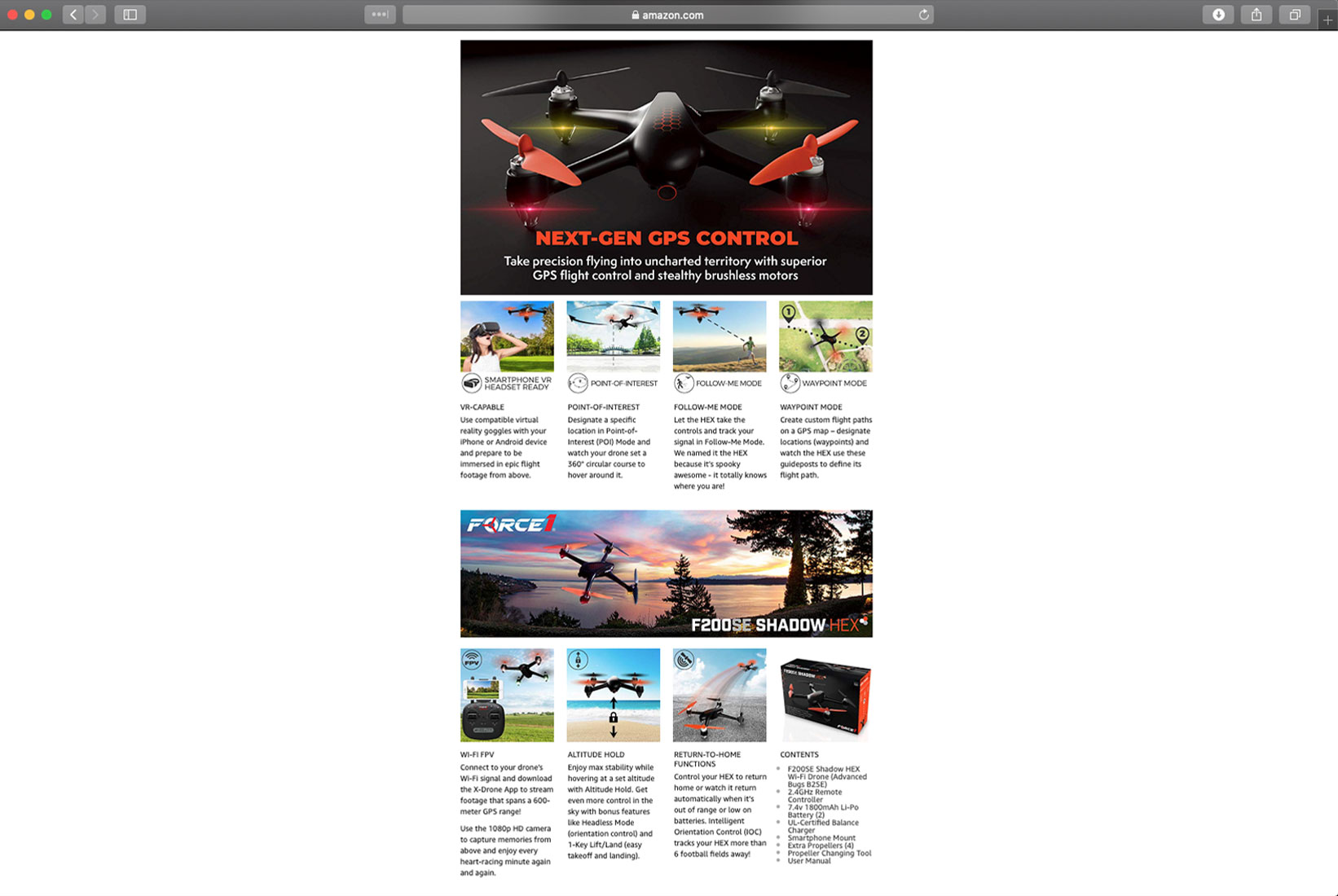 In 2019, Force1 launched the F200SE Shadow Hex, an upgraded version of its predecessor, the F200W Shadow. This feature-rich quadcopter included groundbreaking Wi-Fi and GPS navigational controls like Follow-Me Mode, Flight-Path Mode and Point-of-Interest, a mode that orbits a map point indicated on your smartphone app screen.